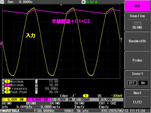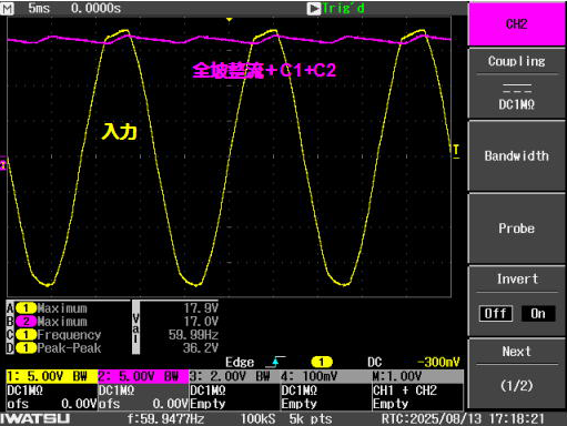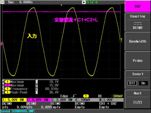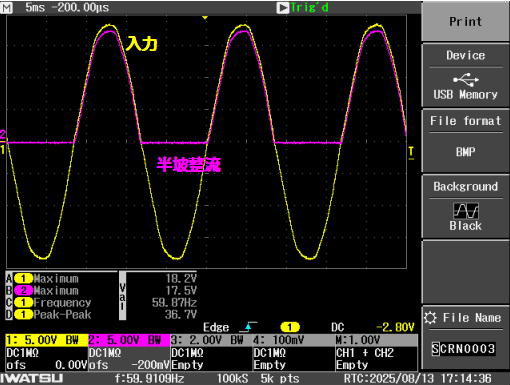 半波および全波整流回路の特性を理解するとともに、濾波器(平滑回路)により脈動を小さくしうることを観測し、電源回路の原理を理解するための実験装置です。