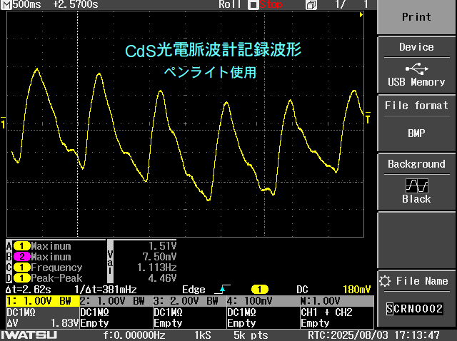 抵抗の直列接続において抵抗値と端子間電圧が比例することの応用としてCdS(光導電素子)を用いて指尖脈派を測定する装置です。